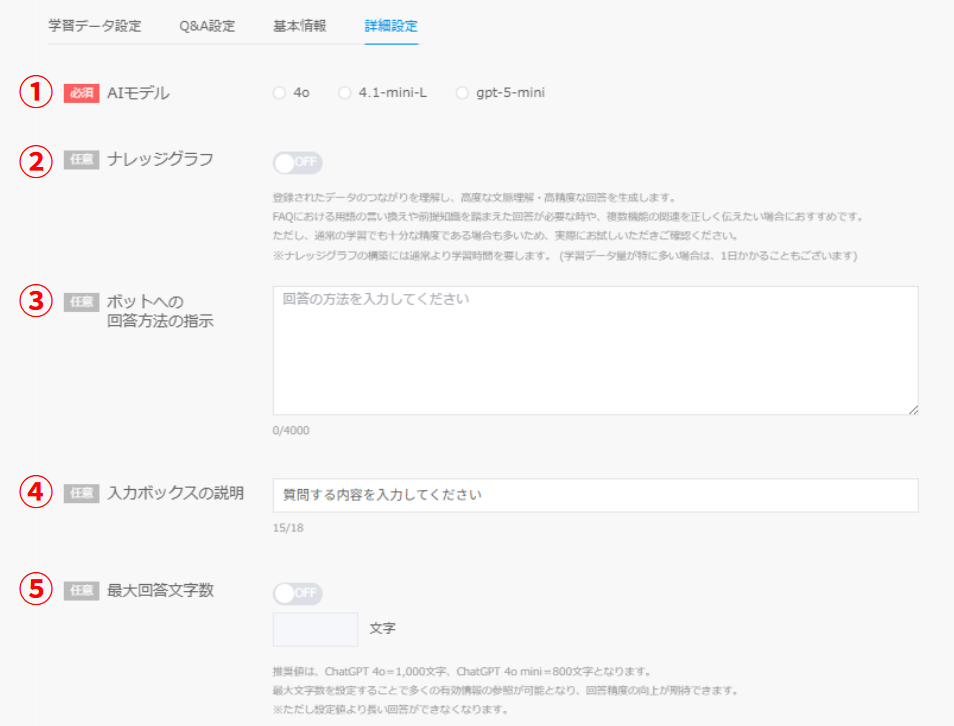 | ⑤ | 最大回答文字数 | 推奨値は、ChatGPT 4o=1,000文字、ChatGPT 3.5=800文字となります。 回答精度の向上と、長すぎる回答を回避するための機能となります。 |