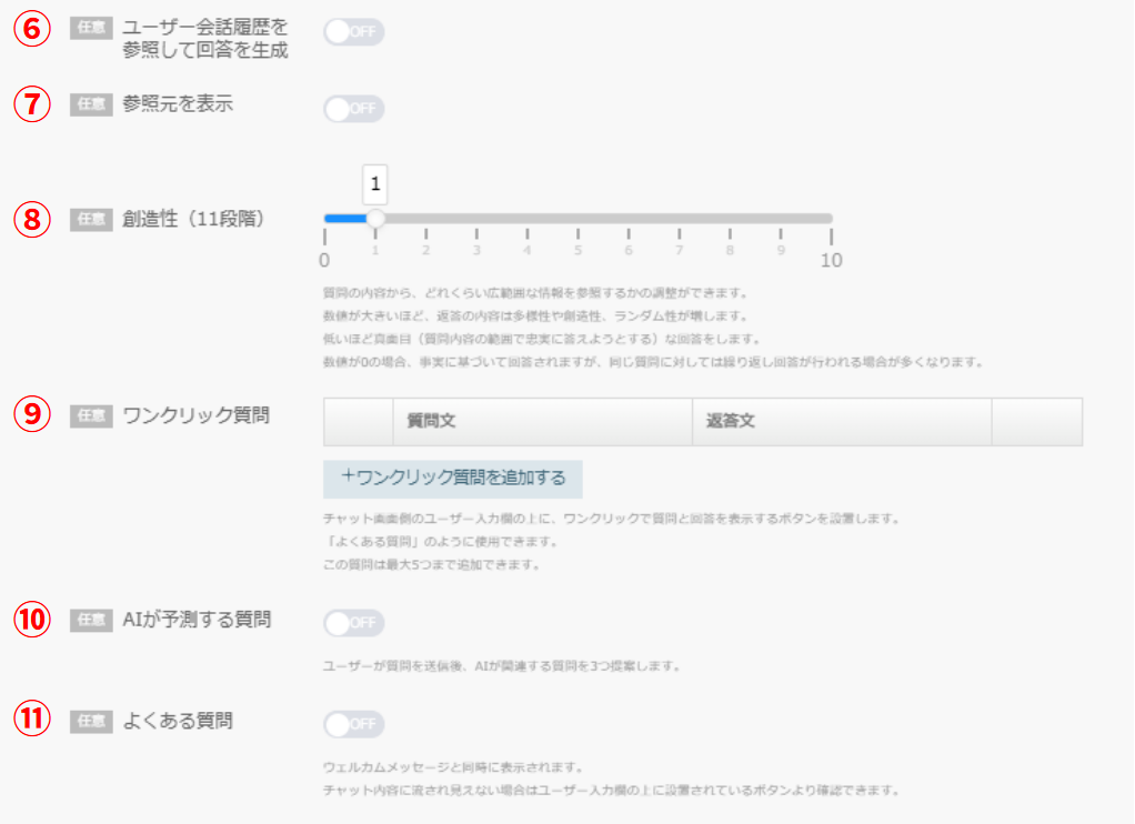| ⑧ | 創造性(11段階) | 数値が大きいほど、返答の内容は多様性や創造性、ランダム性が増します。 逆に低いほど真面目(質問内容の範囲で忠実に答えようとする)な回答をします。 |