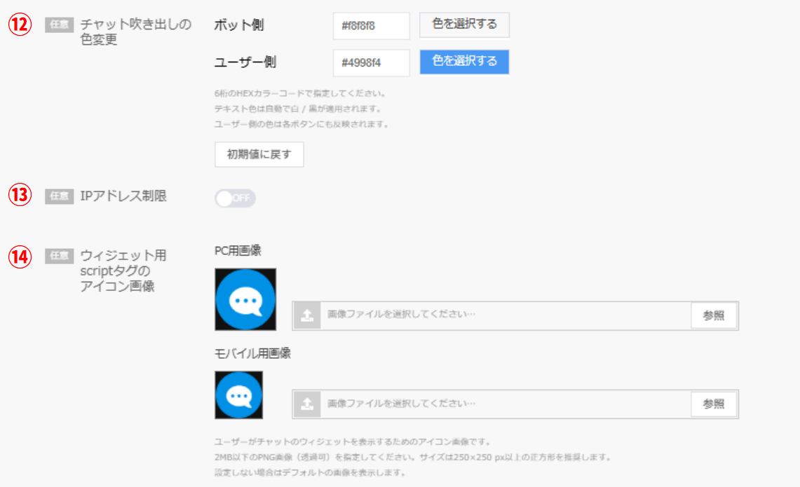 | ⑫ | チャット吹き出しの色変更 | ボット側とユーザー側の吹き出しの色を設定できます。 |