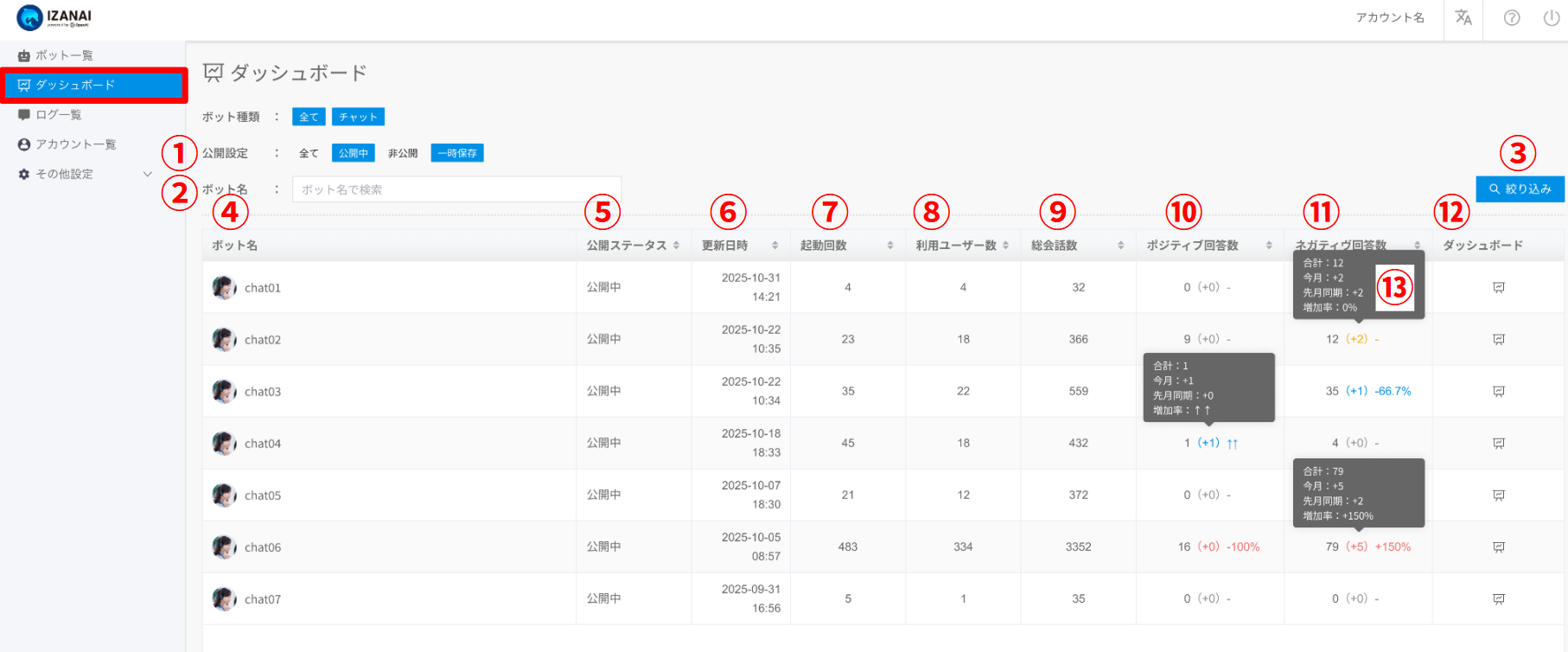 ボットごとに起動回数、利用ユーザー数、総会話数、評価数などの数値が一覧で確認できます。