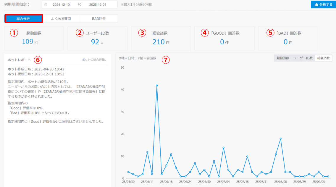起動回数、利用ユーザー数、総会話数、評価数などの数値が一覧で確認できます。