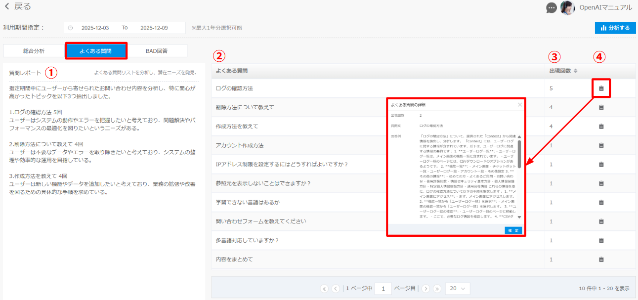 質問レポート よくある質問リストから、特に関心が高いと判断した質問を表示します。