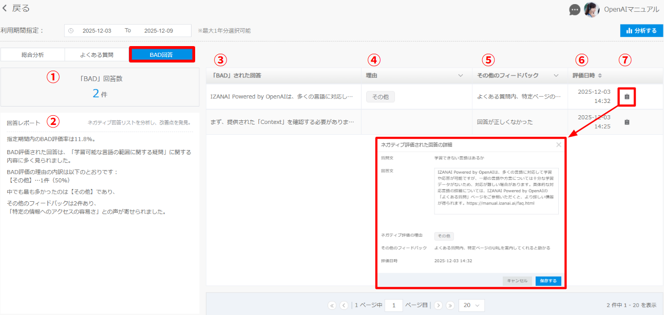 「BAD」された回答 ネガティブ評価が選択された回答が表示されます。