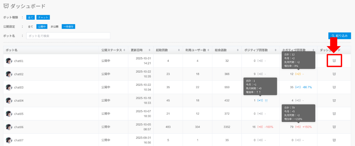 ダッシュボード一覧から各ボットのより細かいデータを確認できます。