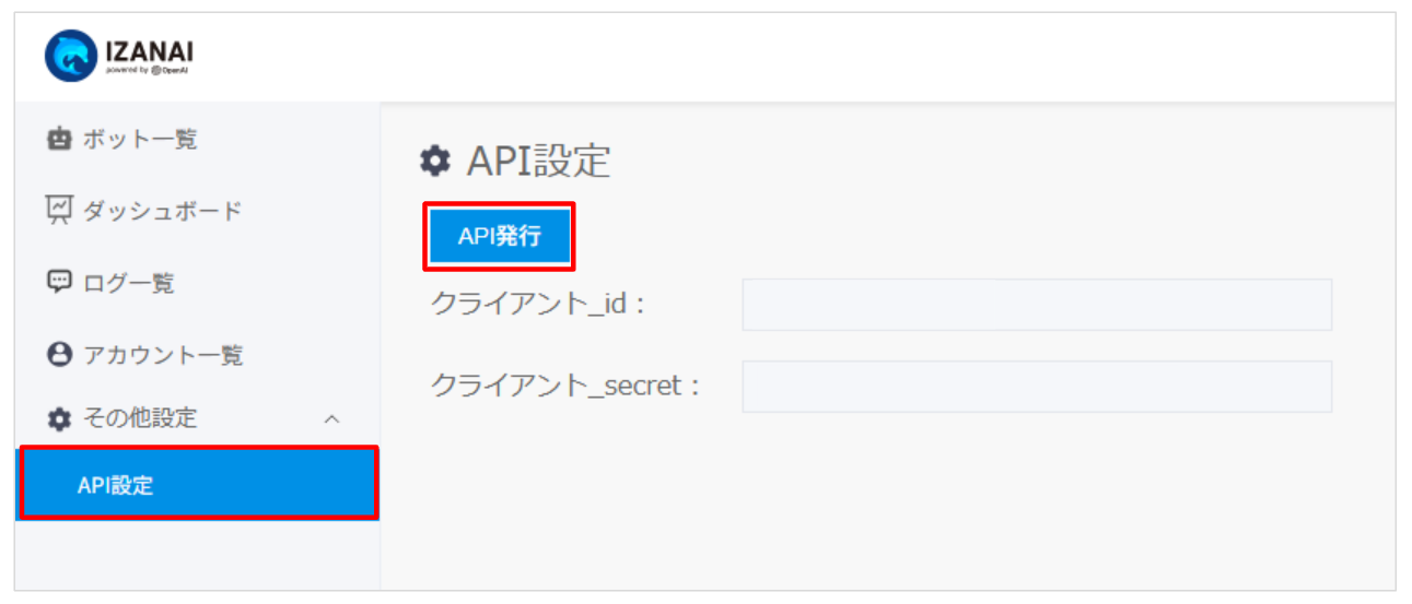 「API発行」をクリックし、「クライアント_id」「クライアント_secret」を発行し、コピーします。