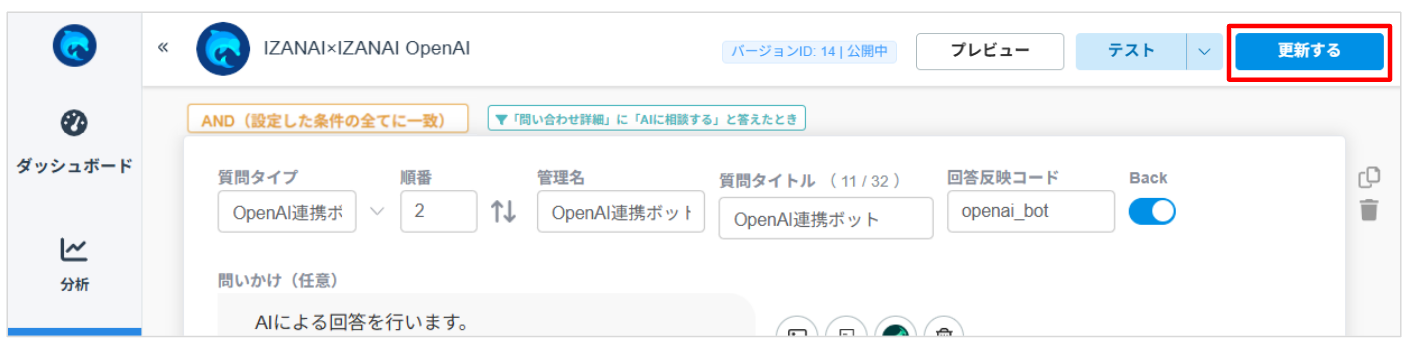 会話フローの設定が完了したら、管理画面右上にらいます「更新する」ボタンから保存して更新(公開)します。