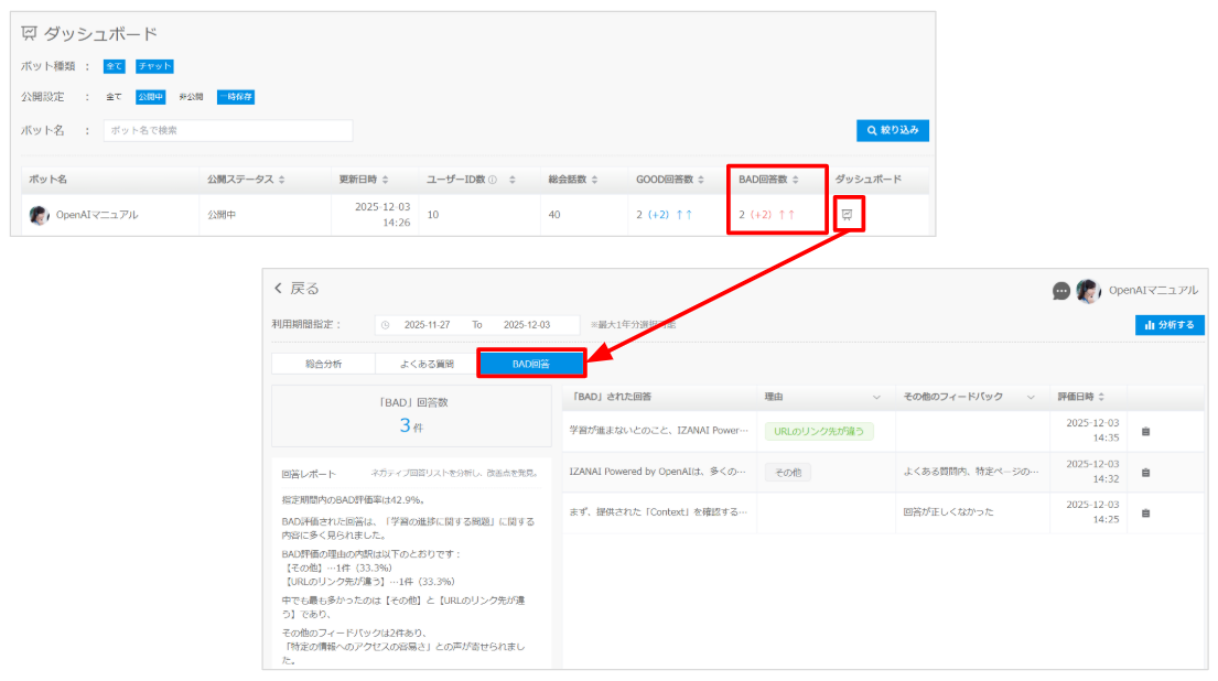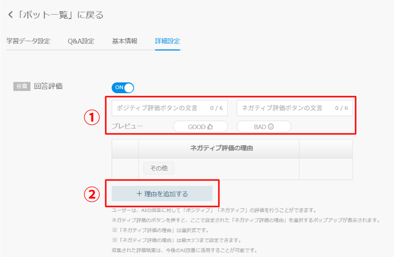 ■回答評価機能の追加 回答の最後に評価機能を付けることが可能になりました。 以下具体的な設定方法と利用方法です。 設定をONにするボット編集画面の「詳細設定」にて回答評価をONにします。