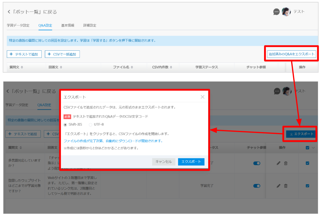 ■Q&A設定にてエクスポート機能追加 Q&A設定にて登録している項目のエクスポートが可能になります。 一括選択、チェック形式どちらでも対応可能です。一括修正を行う場合にご活用ください。 ①「追加済みのQ&Aをエクスポート」をクリック ②一括チェック/エクスポートしたい項目をチェックし「エクスポート」をクリック ③文字コードを選択しエクスポートを実行します ![]() |